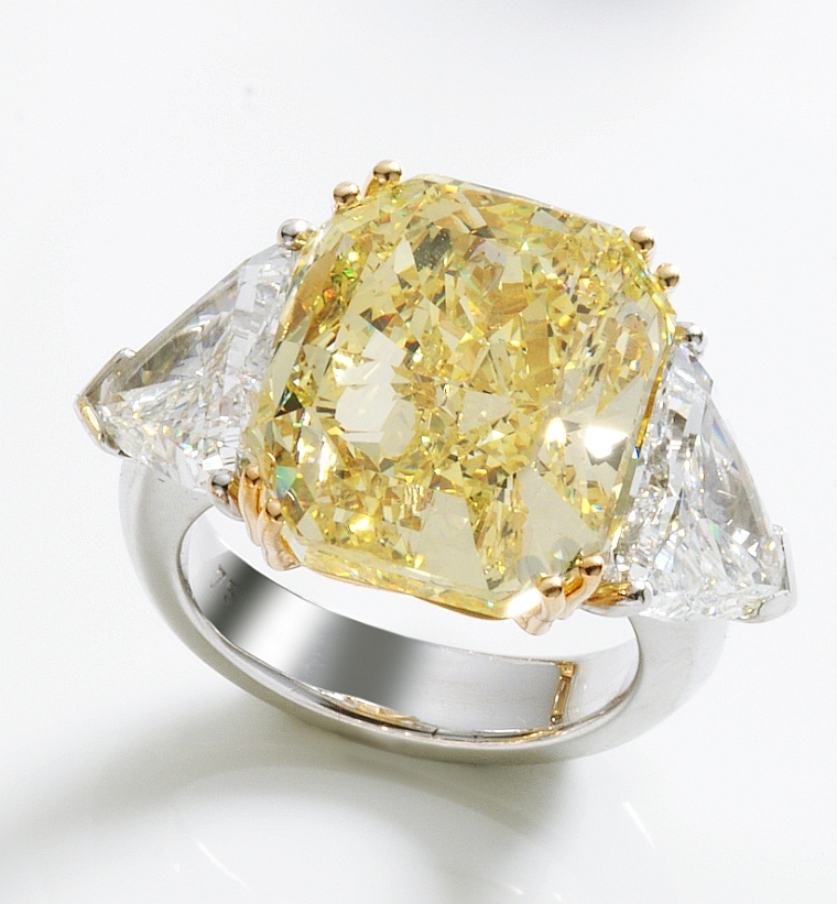 18.52 carats natural fancy intense yellow Diamond with triangle side stones