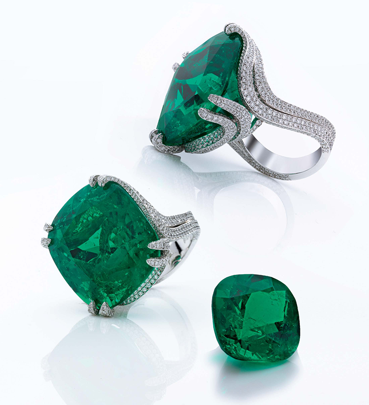 54,55 carats natural Colombian cushion-cut Emerald mounted with brilliant-cut Diamonds