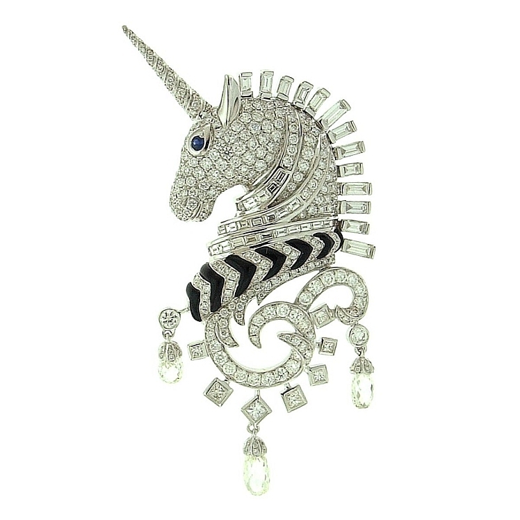 Blue Sapphire, black Onyx and round, baguette, princess cut and briolette Diamonds