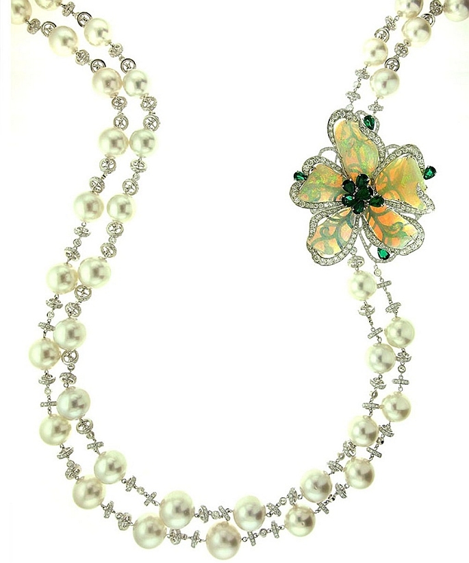 Pear-shaped Emeralds, Opals, White South Sea Pearls and round Diamonds