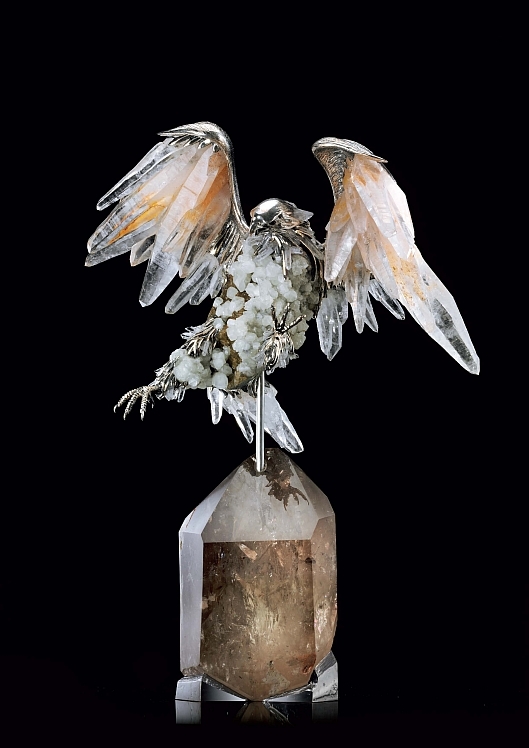 Body in yellow Fluorite and Calcite, wings and tail in crystal Quartz, base smoky Quartz and Silver 925, eyes carved Obsidian.