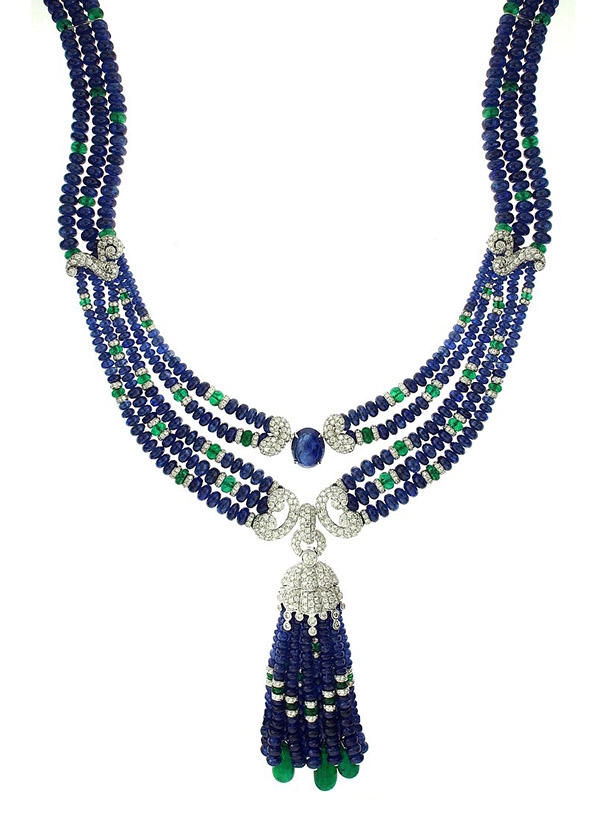 Oval Sapphire Cabochon, drop shaped Emeralds with Sapphire and Emerald Beads and round Diamonds